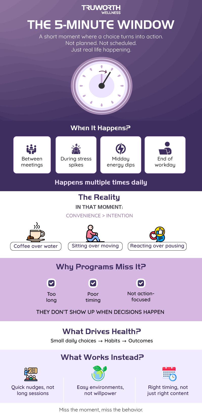 The 5-minute window is a brief, high-influence moment where intention meets action. It is when an employee is not learning about health but actively deciding it.