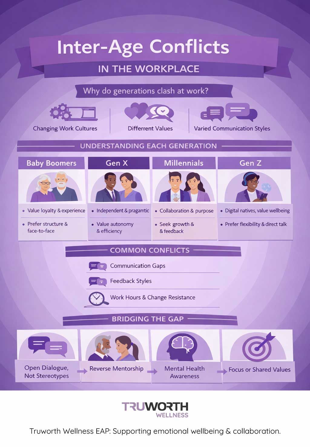 Inter-age conflicts are rarely about age alone. They stem from unspoken stress, emotional fatigue, and lack of psychological safety at work. Truworth Wellness EAP supports organizations by offering confidential counseling, manager sensitization sessions, and emotional well-being programs that help employees communicate better, manage conflict, and feel understood across generations.