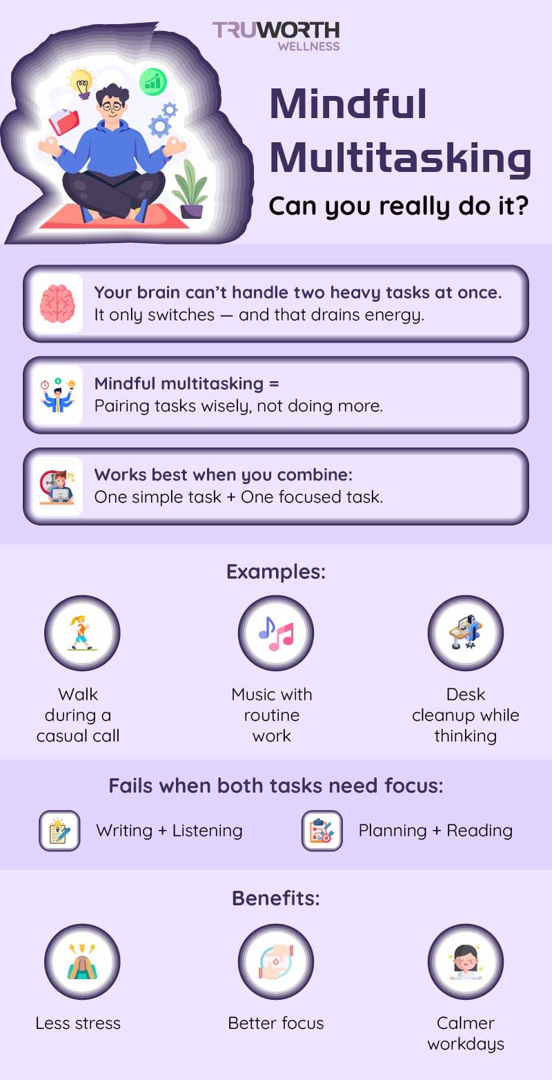 People assume mindful multitasking means doing more tasks calmly. But in reality, it means doing the right tasks together and doing them with awareness. The goal is not to maximise productivity. The goal is to protect your mental energy so you can stay efficient, calm, and clear-headed throughout the day.