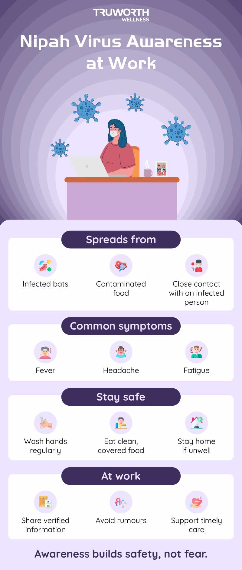 Health awareness at the workplace is not about creating panic. It is about being informed, prepared, and responsible. Nipah virus is a rare but serious infection that occasionally appears in parts of South and Southeast Asia, including India. While outbreaks are uncommon, awareness plays an important role in early prevention and safety.