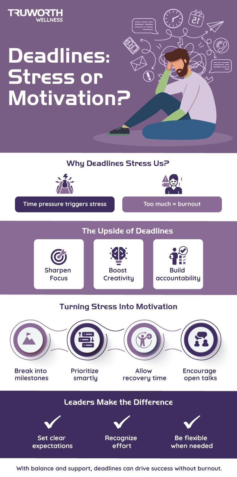 At Truworth Wellness, we help organizations find this balance by building workplace strategies that combine productivity with employee well-being. From stress management programs to leadership coaching, we equip teams to handle deadlines in a healthy, sustainable way. Connect with us today to create a culture where deadlines motivate without burning people out.