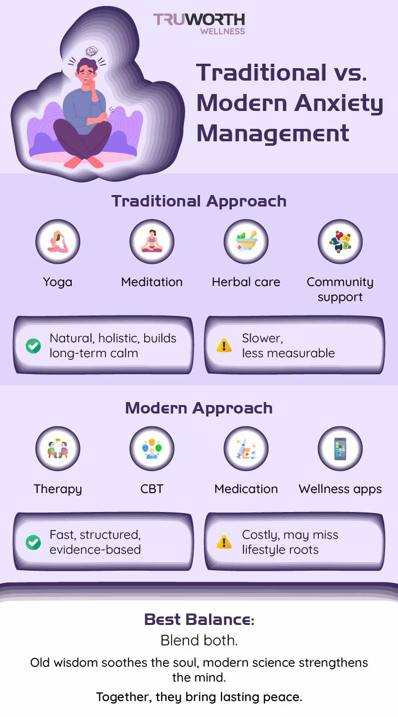 The most effective way to manage anxiety is not by choosing between the two, but by combining them thoughtfully — using ancient calmness as the foundation and modern therapy as the framework.