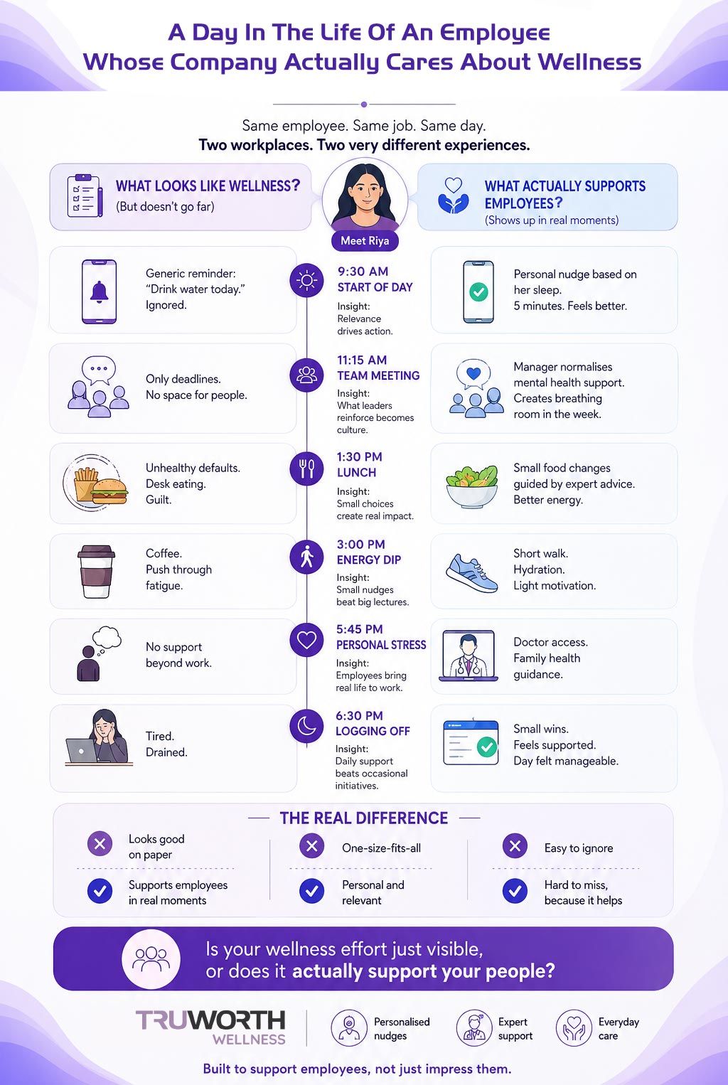 If you are an HR leader thinking about the Riyas on your team, Truworth Wellness builds exactly the kind of everyday wellness infrastructure described above: personalised health nudges, nutrition and mental health access, EAP support, and platforms that treat your employees as individuals, not headcounts.
