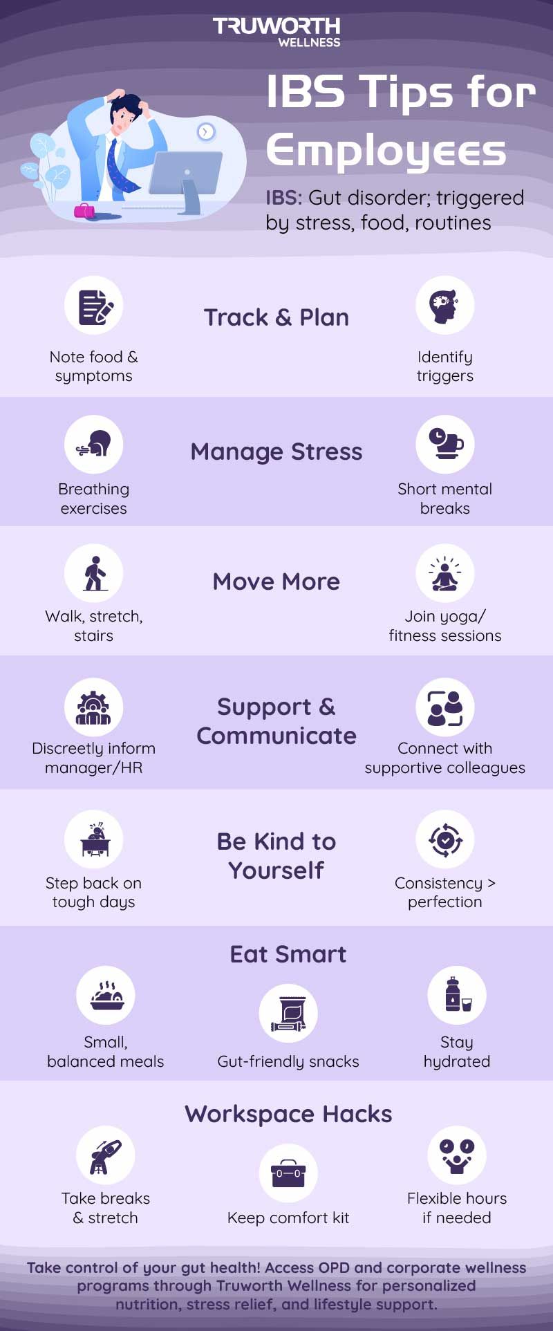 If your workplace offers emotional wellbeing programs or counselling, take advantage of them. A short therapy session or relaxation workshop can reduce IBS flare-ups over time.